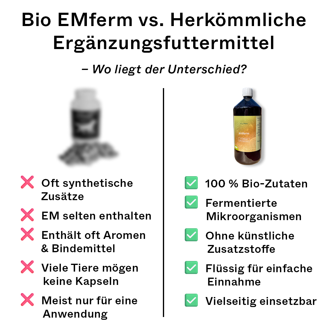 Bio EMferm – Natürliche Unterstützung für dein Tier Ein gesunder Darm ist die Basis für das Wohlbefinden von Tieren. Doch Faktoren wie Umweltbelastungen, ungeeignete Ernährung oder Stress können das mikrobielle Gleichgewicht im Verdauungstrakt beeinträchtigen. Bio EMferm ist ein Ergänzungsfuttermittel auf Basis effektiver Mikroorganismen (EM) und fermentierter Bio-Kräuter. Es kann dabei helfen, eine stabile Darmflora zu fördern und die Nährstoffaufnahme zu unterstützen – ganz ohne künstliche Zusätze. Vielseitig einsetzbar für Hunde, Katzen, Pferde & Co. 100 % natürlich & biologisch Auch zur Pflege von Haut, Hufen & Stallhygiene geeignet Was macht Bio EMferm so besonders? Die fermentierten Mikroorganismen in Bio EMferm können auf natürliche Weise dazu beitragen, das innere Gleichgewicht zu unterstützen. Dabei wird das Produkt nach einem schonenden Fermentationsprozess hergestellt, um die volle Kraft der enthaltenen Kräuter zu erhalten. Unterstützung für die Verdauung – Kann helfen, die Darmflora im Gleichgewicht zu halten. Vielseitig anwendbar – Nicht nur als Futterzusatz, sondern auch für Haut- und Fellpflege sowie Stallhygiene geeignet. 100 % Bio-Qualität – Ohne künstliche Zusätze oder Chemie. Einfache Anwendung – Flüssige Form, leicht ins Futter zu mischen oder äußerlich anzuwenden. Das steckt dir (DE-ÖKO-037) Wasser Fermentierte Bio-Kräuter: Brennnessel, Schwarzkümmel, Leinsaat, Salbei, Aronia, Löwenzahn, Kapuzinerkressenkraut, Teufelskralle, Meerrettich, Ingwer Bio-Zuckerrohrmelasse als Fermentationsgrundlage Wie wird Bio EMferm angewendet? Innerliche Anwendung (Futterergänzung)✔ Hunde & Katzen: 10 ml täglich ins Futter mischen✔ Kaninchen & Meerschweinchen: 5 ml täglich ins Futter mischen✔ Pferde & Ponys: Erwachsene Tiere 2 × 10 ml täglich ins Futter oder direkt ins Maul geben✔ Ziegen & Jungtiere: 1 × 10 ml täglich ins Futter oder direkt ins Maul geben Äußere Anwendung (Pflege & Hygiene)✔ Für Hautfalten & Hufe: Pur oder mit Wasser verdünnt (200 ml auf 1 l Wasser) auftragen✔ Für die Stallhygiene: 100 ml auf 1 l Wasser mischen und auf Liegeflächen oder Einstreu sprühen Natürliche Unterstützung für eine bewusste TierhaltungBio EMferm wurde entwickelt, um Tierhaltern eine biologische und natürliche Ergänzung für eine ganzheitliche Tierpflege zu bieten. Es kann helfen, das Wohlbefinden deines Tieres zu unterstützen – von innen und außen. Wichtige Hinweise: Bio EMferm ist kein Arzneimittel und ersetzt keine tierärztliche Behandlung. Natürliche Produkte können je nach Tier individuell wirken. 100 % Bio, ohne künstliche Zusätze & vielseitig anwendbar – Bio emferm jetzt testen.
