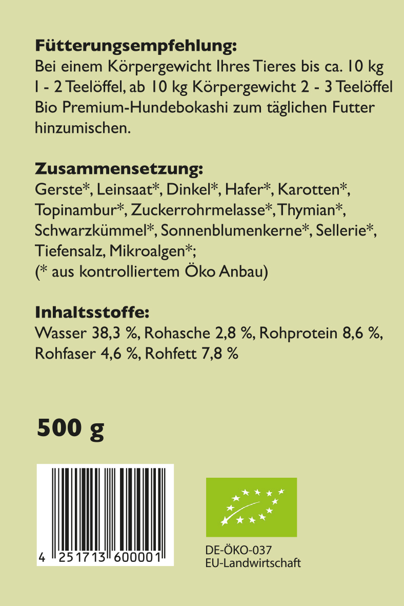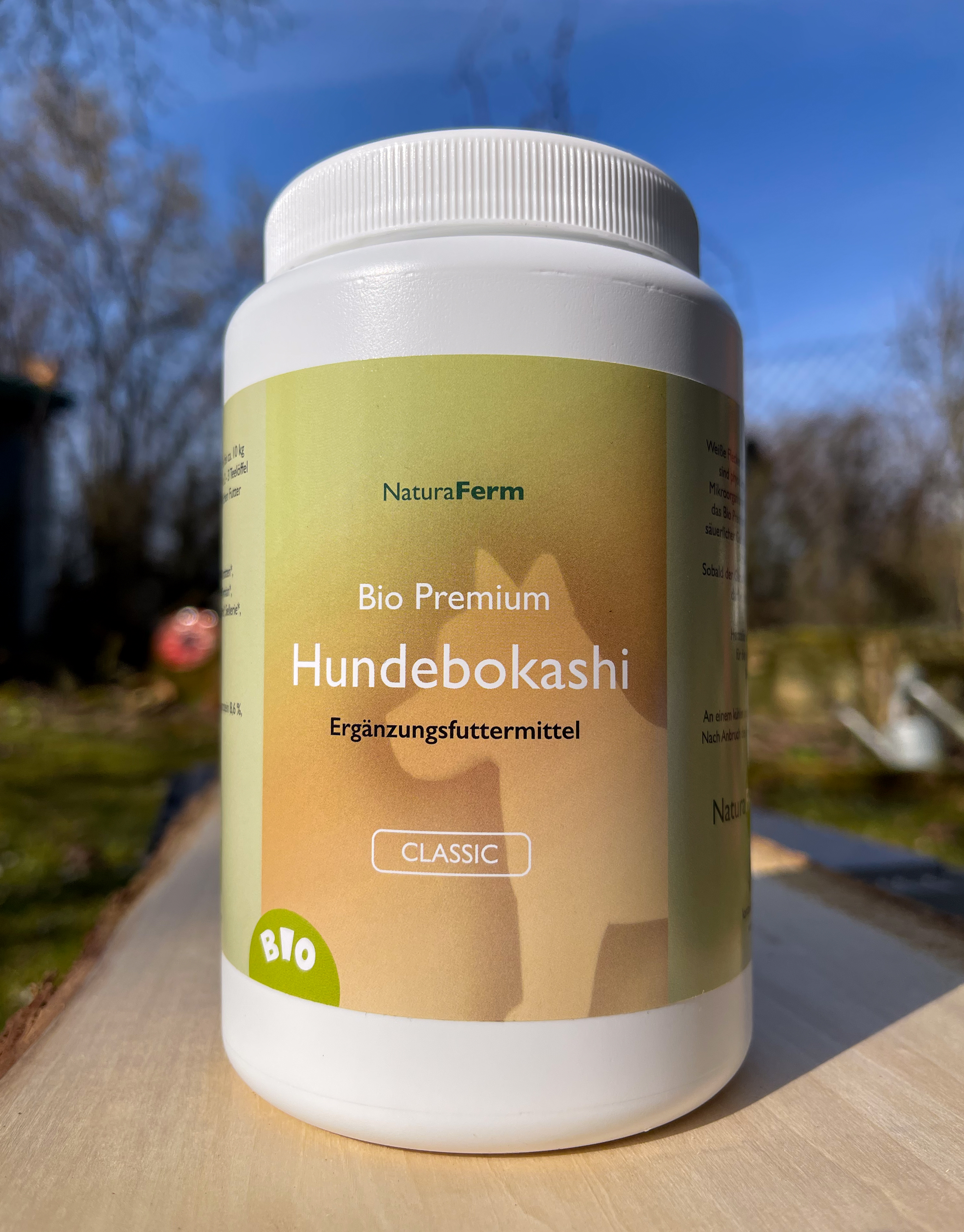 Ein hochwertiges Hunde-Ergänzungsfutter aus besten Zutaten, genau das ist unser NaturaFerm Hundebokashi. Natürliche Rohstoffe in Bio-Qualität und effektive Mikroorganismen können eine gesunde Darmflora fördern und eignen sich hervorragend als unterstützender Zusatz zum Nass- oder Trockenfutter. Zusammensetzung:Gerste*, Leinsaat*, Karotten*, Dinkel*, Hafer*, Topinambur*, Zuckerrohrmelasse*, Mikroalgen*,Salz, Thymian*, Kümmel*, Sonnenblumenkerne*, Sellerie*(*aus kontrolliertem Öko-Anbau)Fütterungsempfehlung: Bei einem Körpergewicht Ihres Tieres von bis ca.10 kg 1- 2 Teelöffel Premium Hundebokashi, ab 10 kg Körpergewicht 2 - 3 Teelöffel Premium Hundebokashi zum täglichen Futter hinzumischen. Aus rechtlichen Gründen beachten Sie bitte folgenden Hinweis: Grundsätzlich soll bei der aufgeführten Beschreibung der Anwendung von Hunde-Bokashi nicht der Eindruck erweckt werden, dass diesem ein Heilversprechen unsererseits zugrunde liegt. Ebenso wenig kann aus den Ausführungen abgeleitet werden, dass Linderung oder Verbesserung eines Krankheitszustandes beim Tier garantiert oder versprochen werden kann.