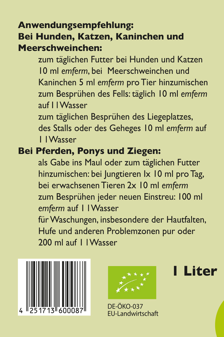 Anwendungsempfehlung:Bei Hunden, Katzen, Kaninchen und Meerschweinchen: zum täglichen Futter bei Hunden und Katzen 10 ml emFerm, bei Kaninchen und Meerschweinchen 5 ml emFerm pro Tier hinzumischen zum besprühen des Fells täglich 10 ml emFerm auf 1 L Wasser zum täglichen Besprühens des Liegeplatzes, des Stahls oder des Geheges 10 ml emFerm auf 1 L Wasser Bei Pferden, Ponnys und Ziegen: als Gabe ins Maul oder zum täglichen Futter hinzumischen: bei Jungtieren 1x 10 ml pro Tag, bei erwachsenen Tieren 2x 10 ml emFerm zum Besprühen jeder neuen Einstreu: 100 ml emFerm auf 1 L Wasser für Waschungen, insbesondere der Hautfalten, Hufe und anderen Problemzonen pur oder 200 ml auf 1 L Wasser Zusammensetzung: Wasser, Bio-Zuckerrohrmelasse*, fermentierte Kräuter: Brennessel*, Kümmel*, Leinsaat*, Aronia*, Löwenzahn*, Kapuzienerkressenkraut*, Salbei*, Teufelskralle*, Meeretich*, Ingwer*. (*aus kontrollierten Öko-Anbau) Inhalt: 10 Liter