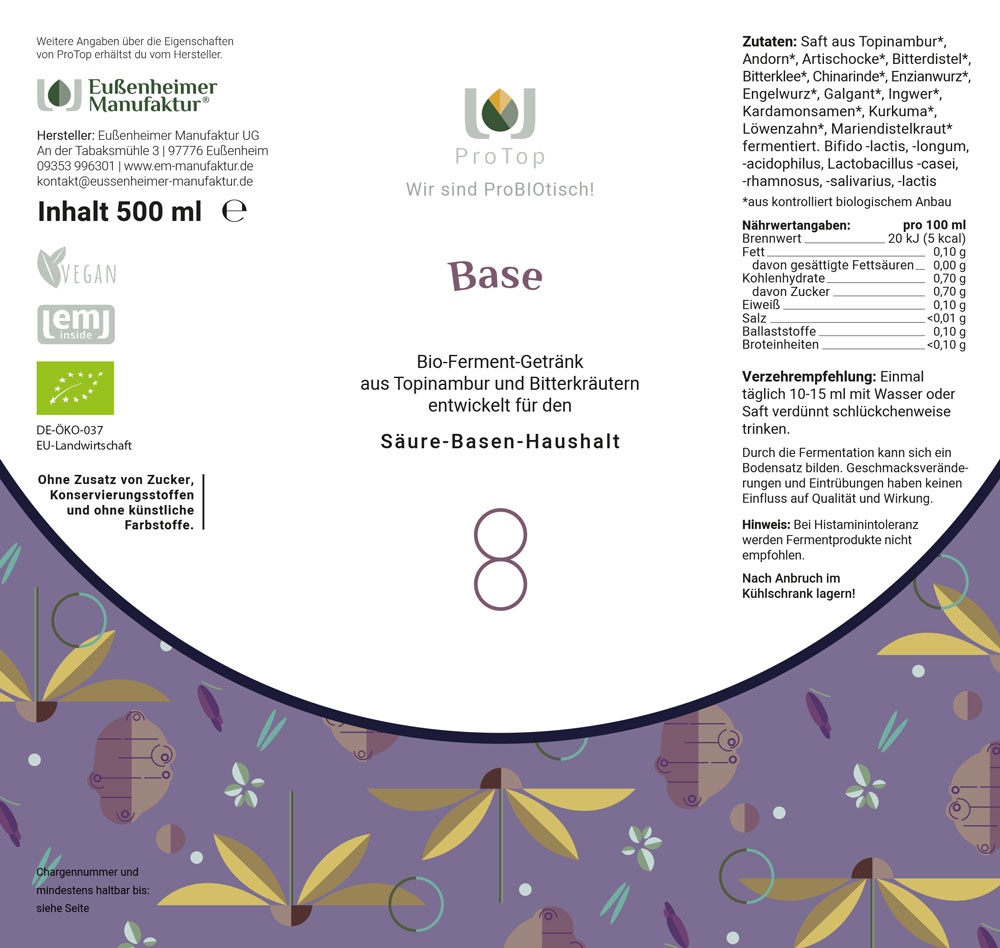 Pro-Top Base ist mehr als "nur" ein Fermentationsgetränk. Pro-Top Base kombiniert die Vorzüge von biologisch angebauter Topinambur aus gesunden heimischen Böden mit aktuellsten Erkenntnissen über Effektive Mikroorganismen nach Prof. Higa. Diese finden vom Anbau der Pflanze bis zur Abfüllung des fertigen Getränks permanente Anwendung und führen so zu zusätzlichen Vorteilen.